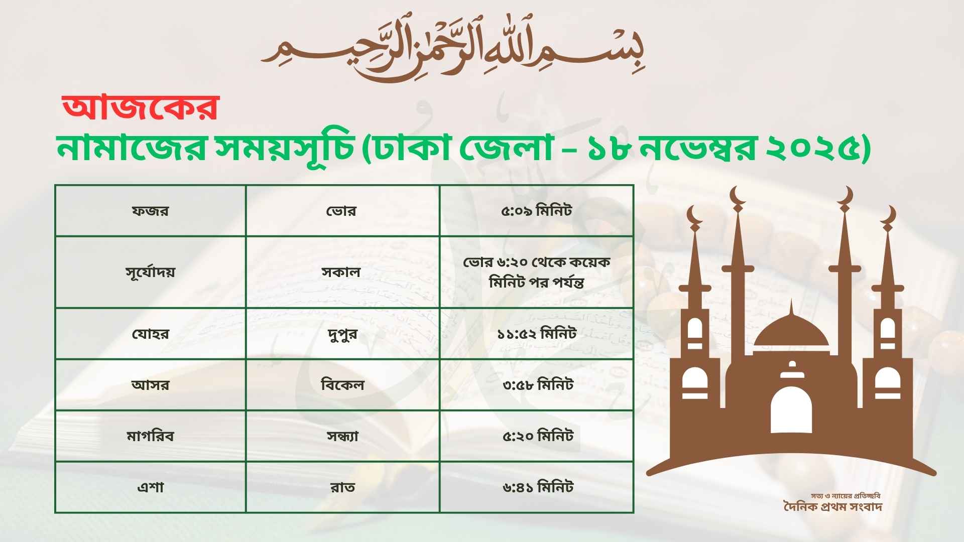 আজকের নামাজের সময়সূচি (ঢাকা জেলা - ১৮ নভেম্বর ২০২৫)